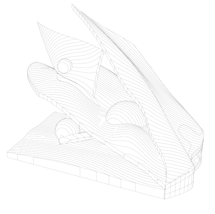 이동/복사/회전/스케일로 작은 창발적 변이를 주면서 주 제스처의 지속적 읽기를 탐구한다. 이어서 디지털 텍토닉 전환을 수행해 모델 내부에서 두께와 결구를 가정하고 읽기의 변화를 확인한다. 초점은 제스처가 어디서 읽히는지를 보여주는 드로잉과 간결한 주석 시퀀스에 있다.