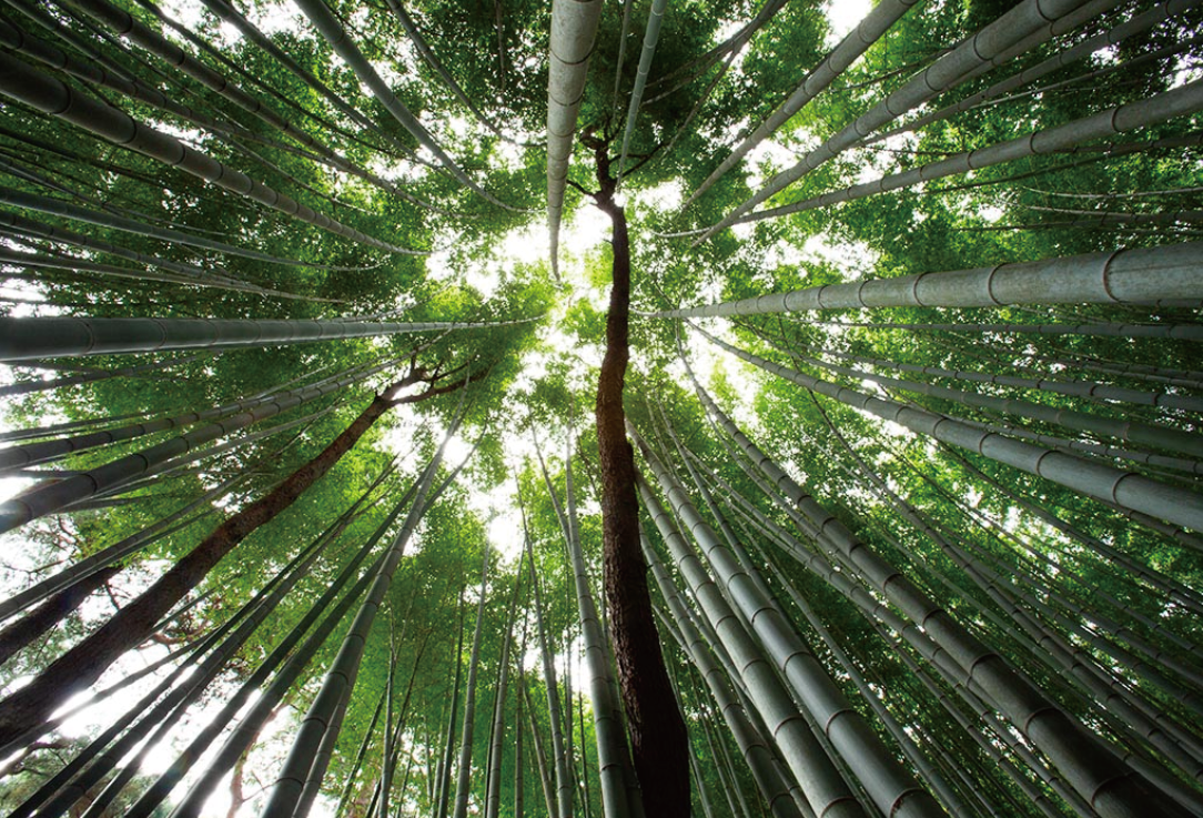 - Left image — Bamboo trunks radiate toward a bright sky aperture; converging lines frame a central void.