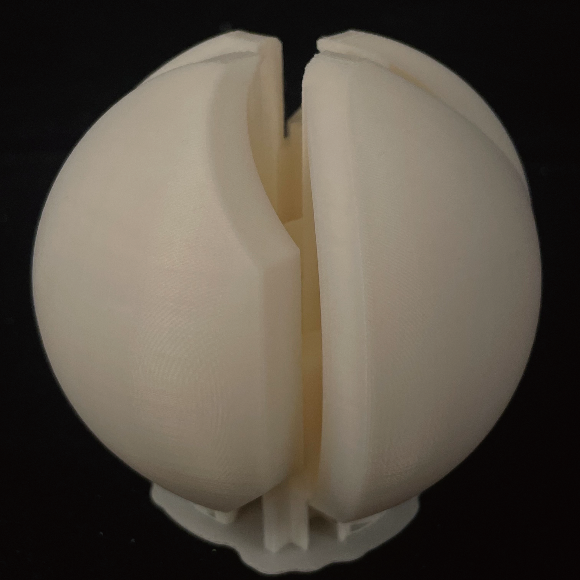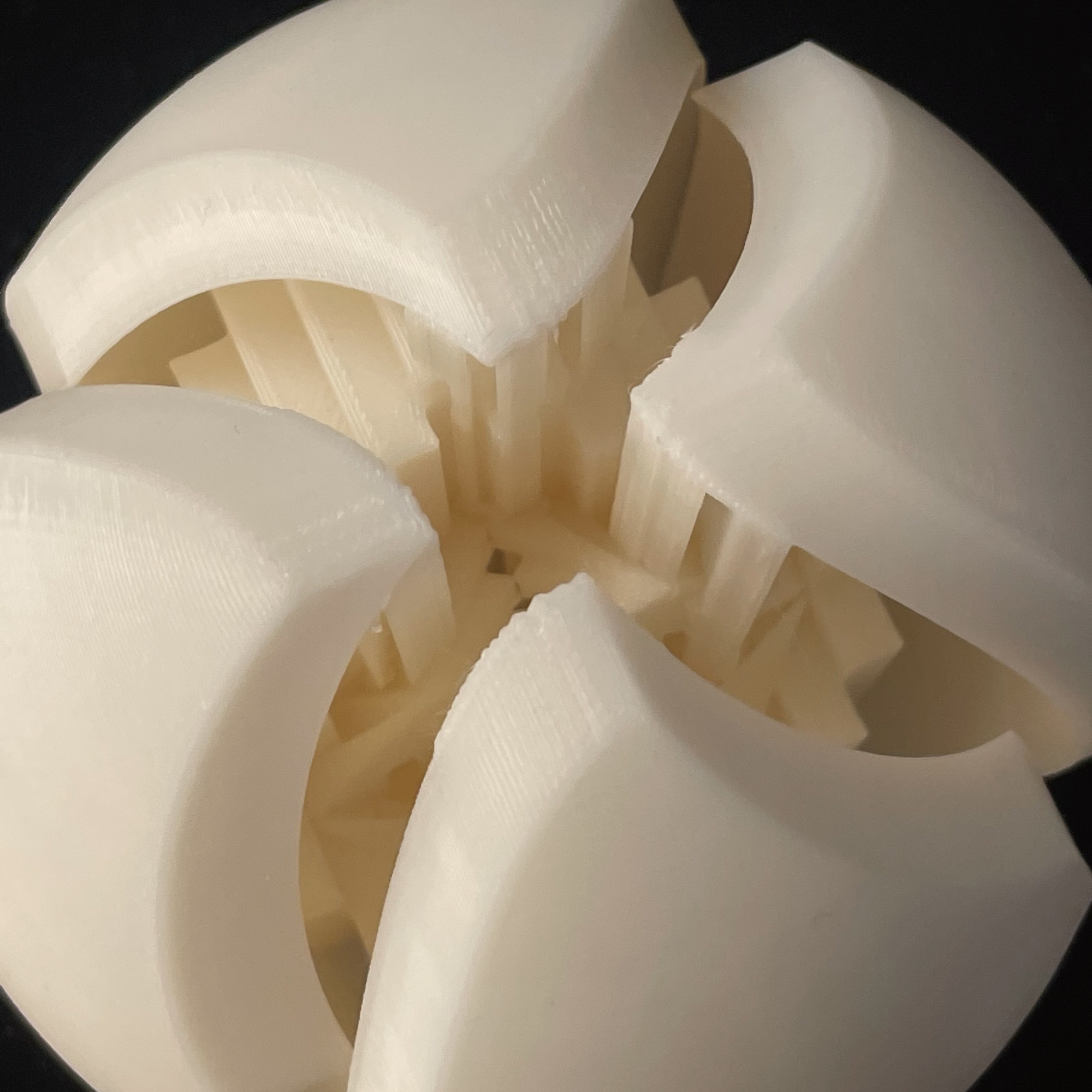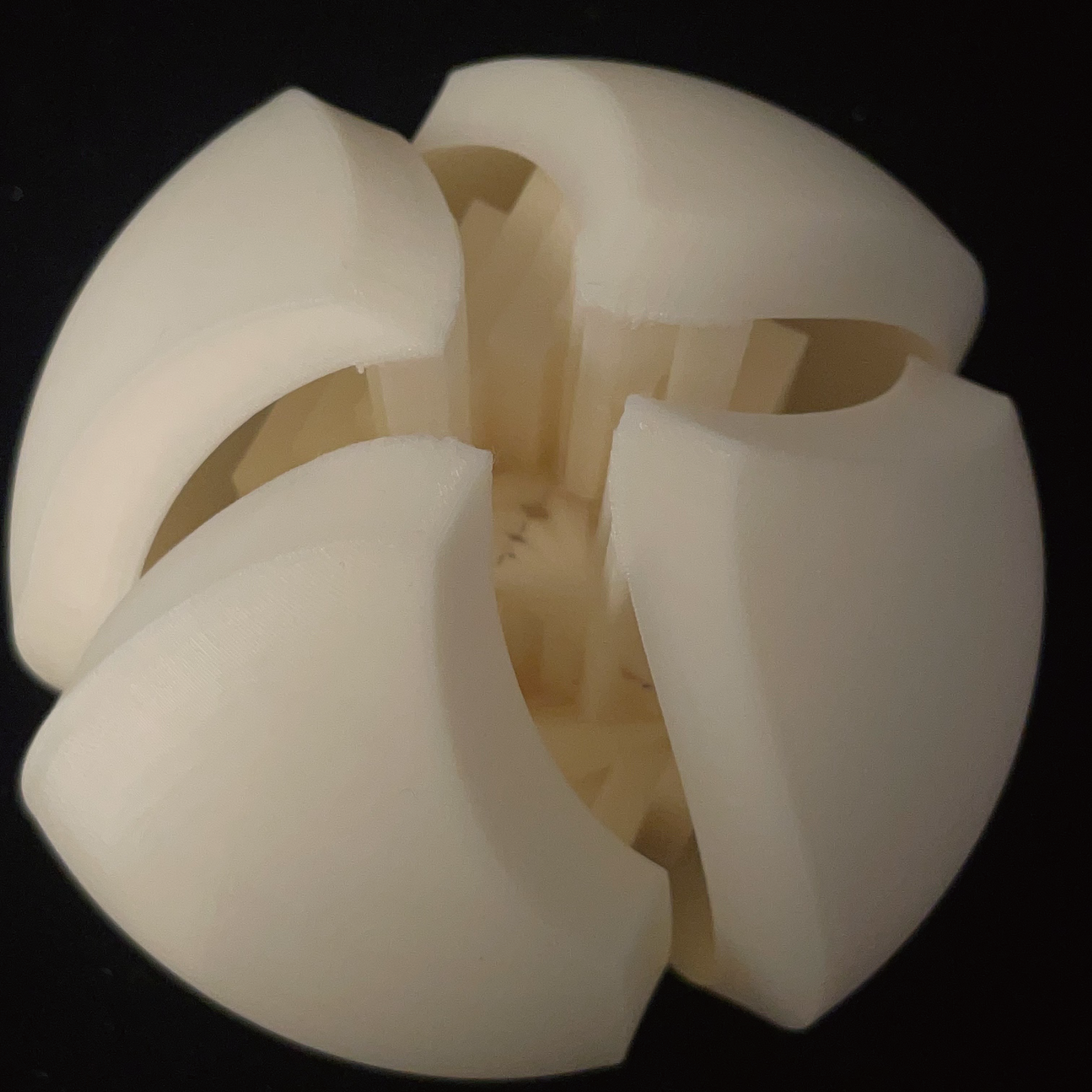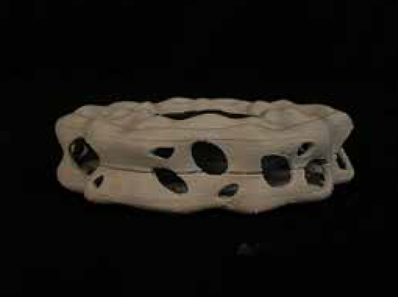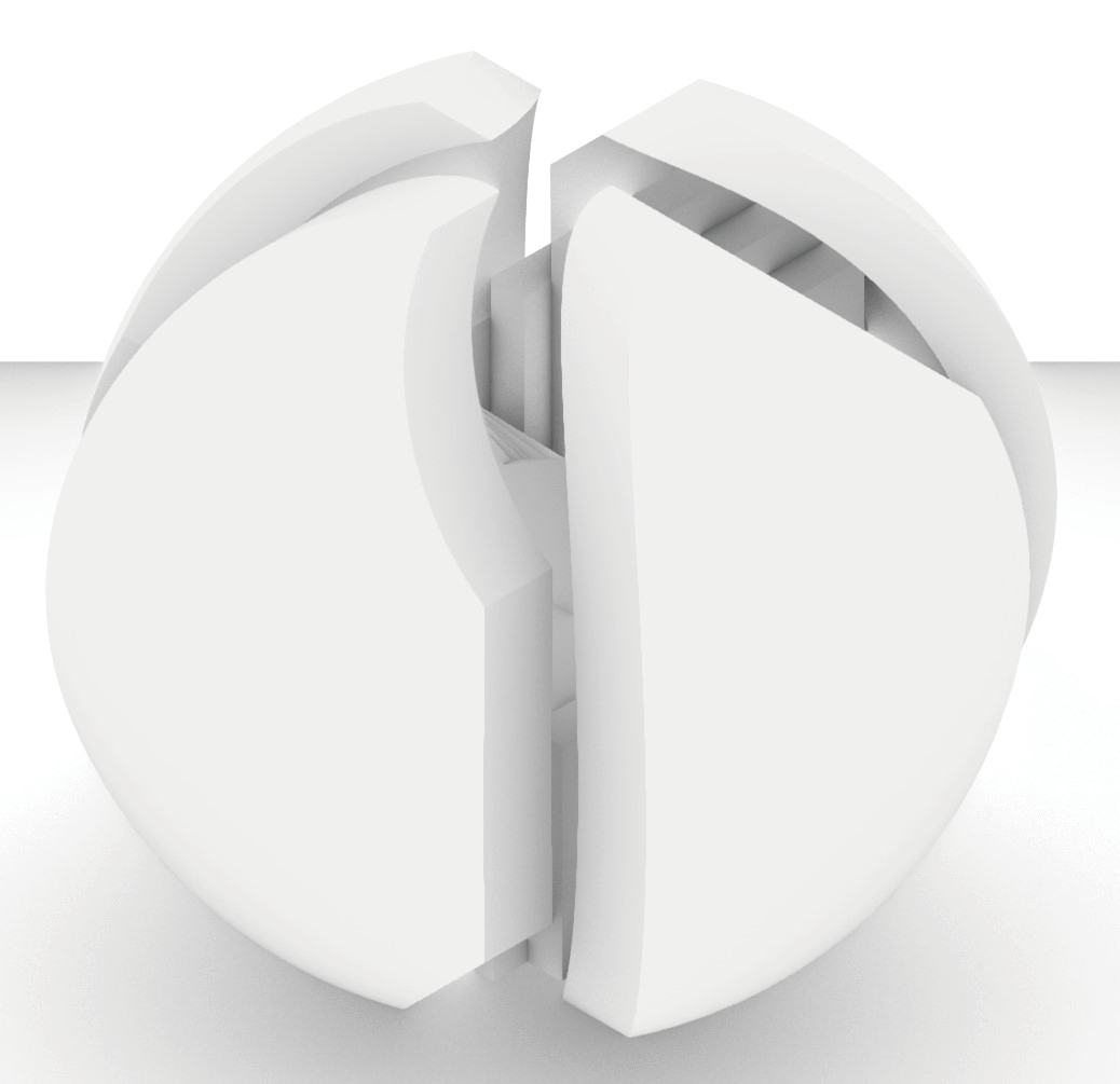 - “Mass + interior void”: a hollowed center read through layered shells.