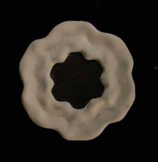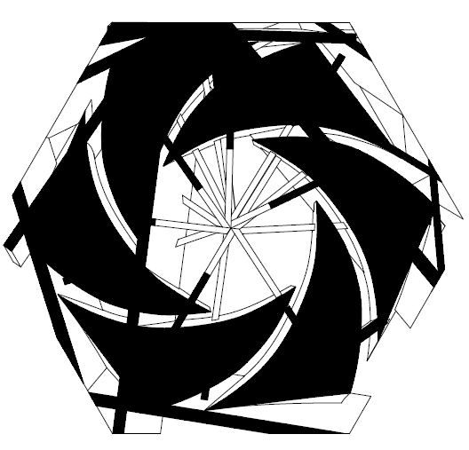 - Left image — A hexagonal aperture mark with rotating blades → seeds rotational symmetry and a voided center.