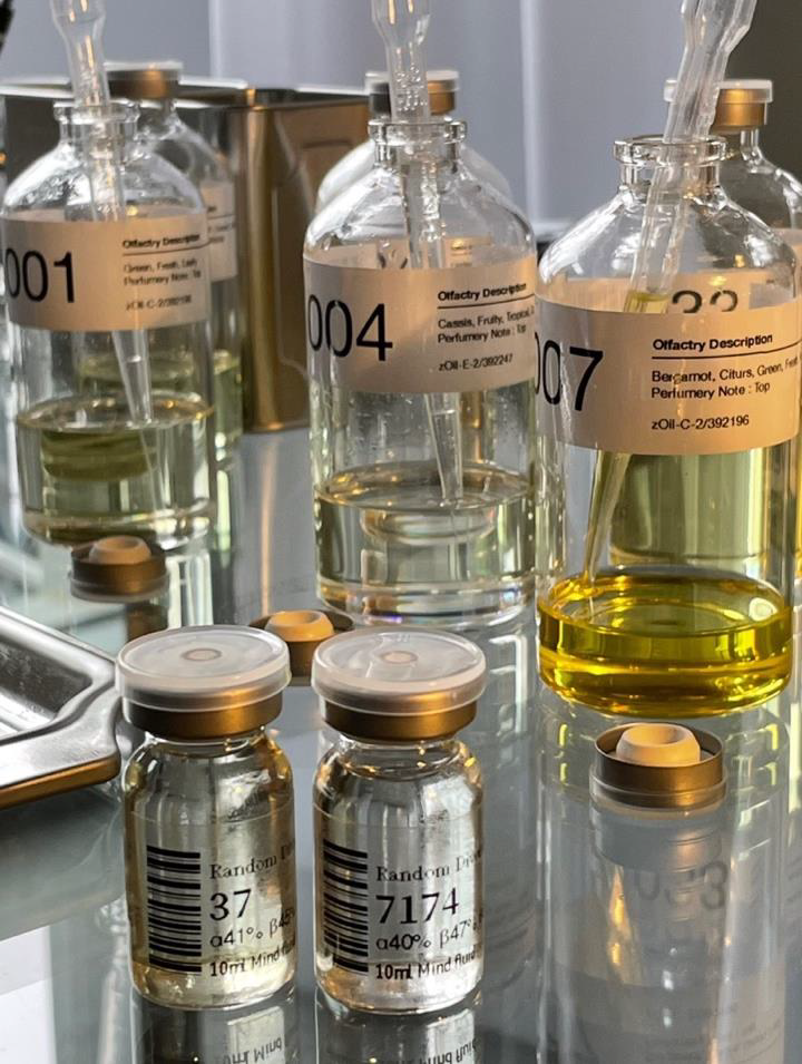 - Left image — Perfume vials/pipettes set cylindrical modules and a neat benchline → seeds stacked, repeatable loops.