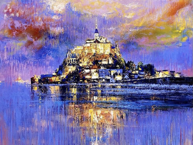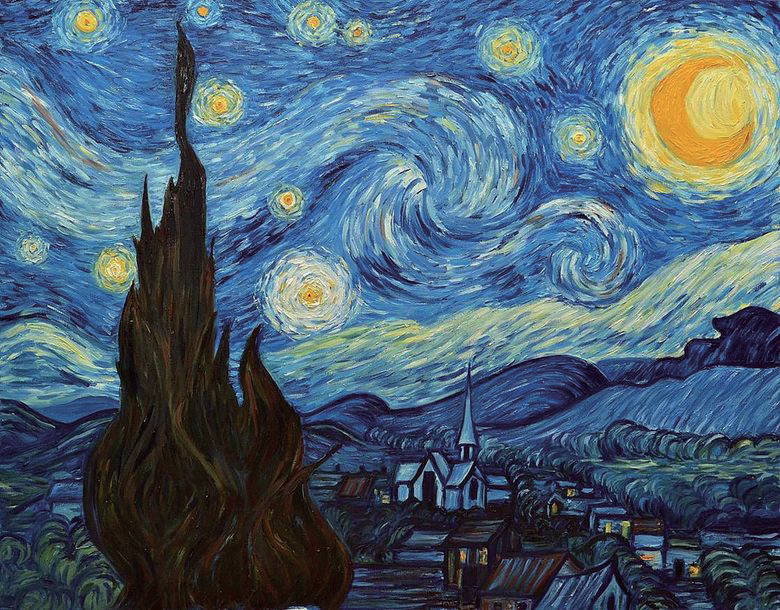 - Left image — Swirling strokes in the night sky organize into periodic eddies → suggests background meter with accents.