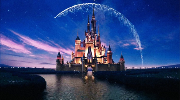 - Left image — The Disney castle under an arcing spark trail → centralized mass + ceremonial arc.