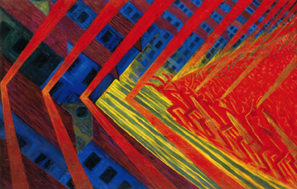 - Right image — A Futurist painting of diagonal vectors → seeds aggressive tilts + motion around the core.