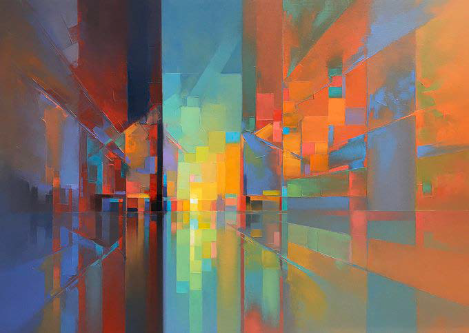 - Right image — Abstract cityscape with strong perspective → seeds a spine/vanishing depth.
