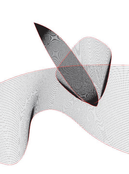 Spear-nose thrust with swept “wings” and a ribboned wake riding a calm datum.