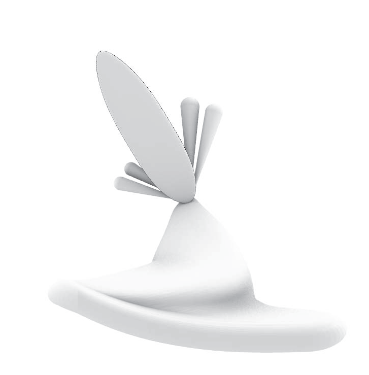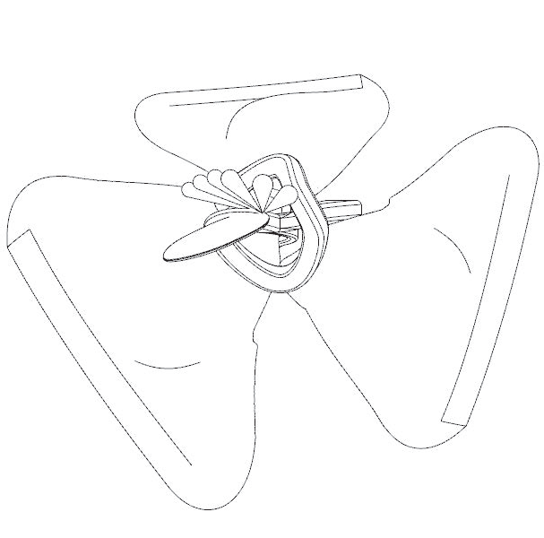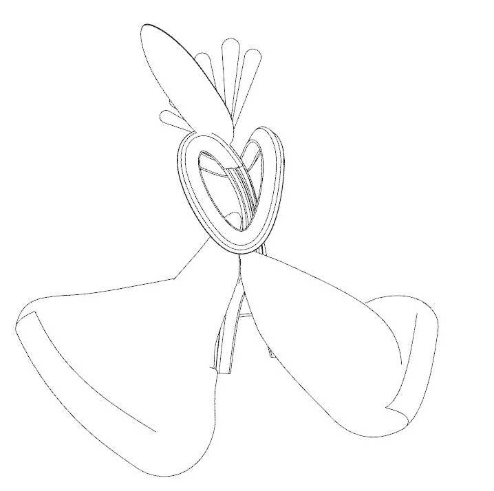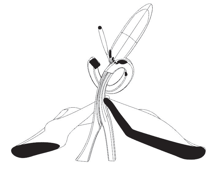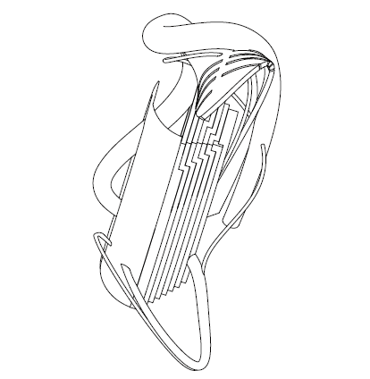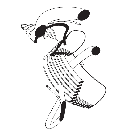Curved spine with pendant pods; flipper-like blades loop along a guiding arc.