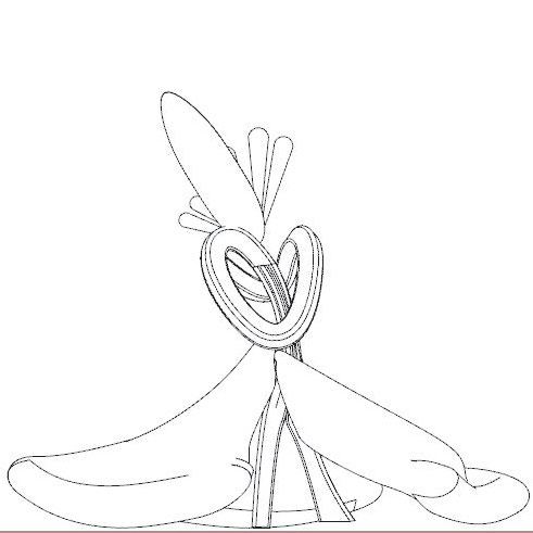 Tilted crest with an upright fin, anchored by a ring hub; skirted drape radiates from the center.