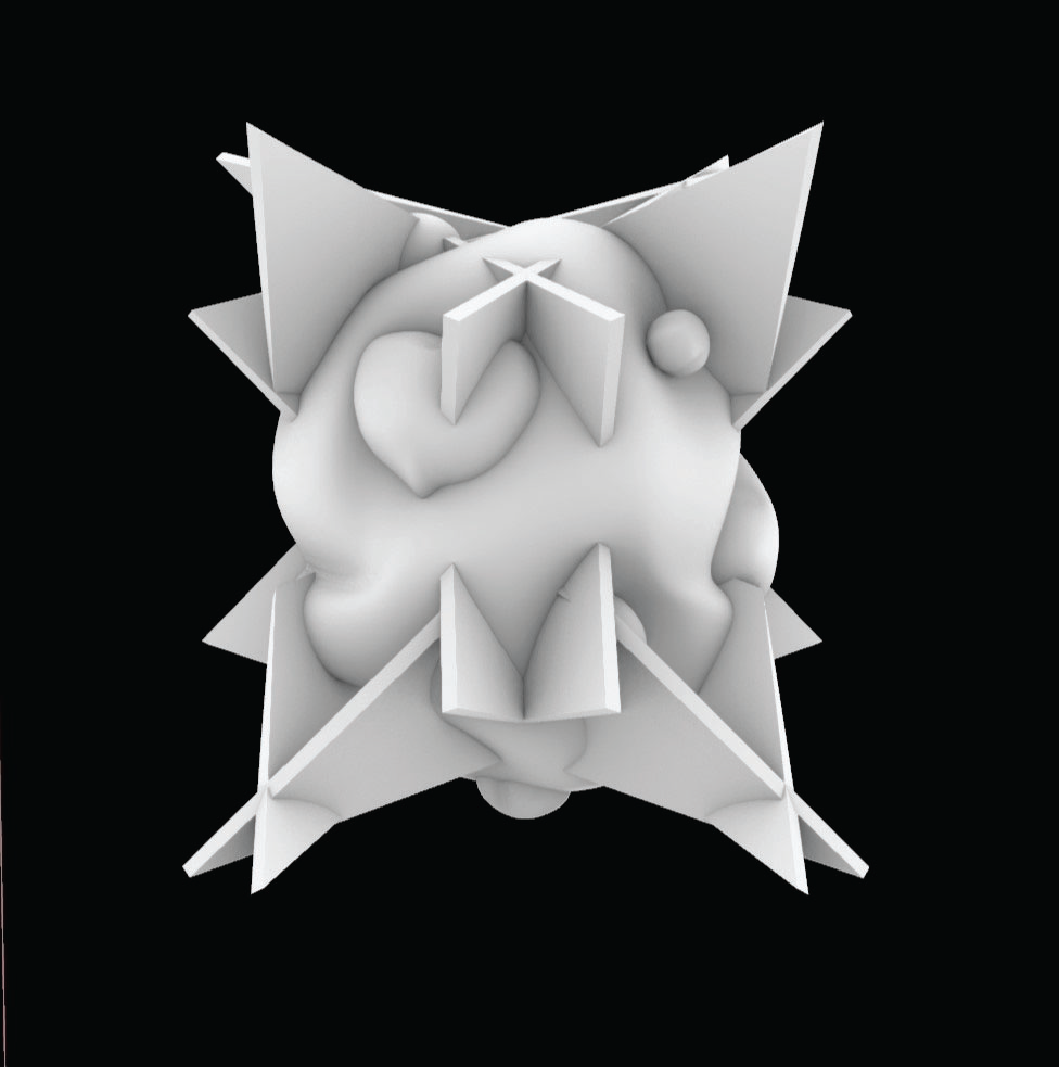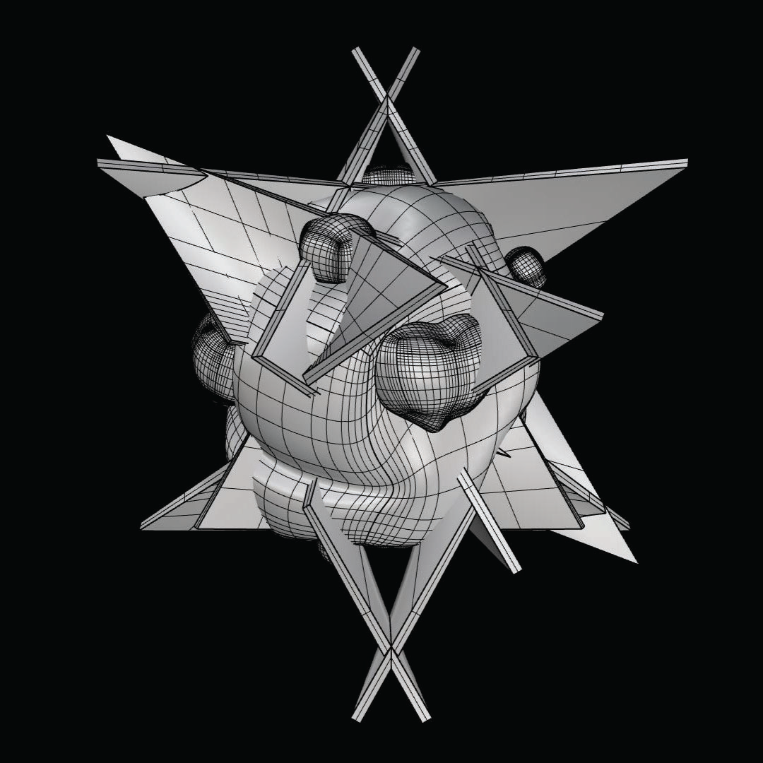 Bulbous core with radial peaks; facial cavities become indexed voids on a spiked “mountain-star.”
