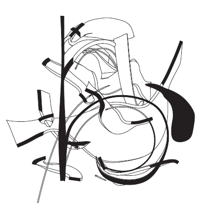 A rising spiral ribbon opposed by a rectilinear gate; equilibrium between swirl and frame.