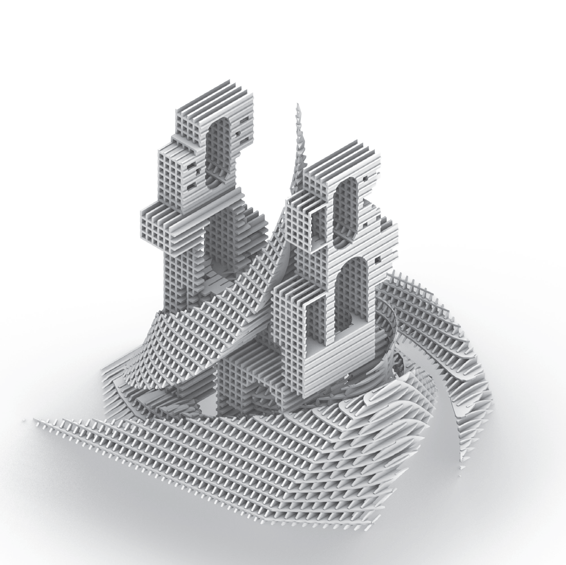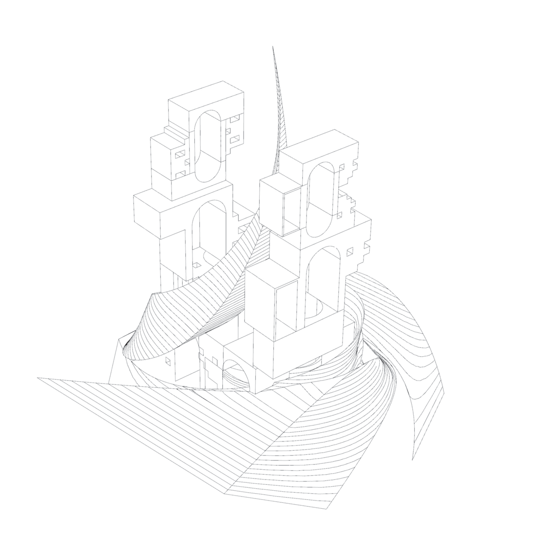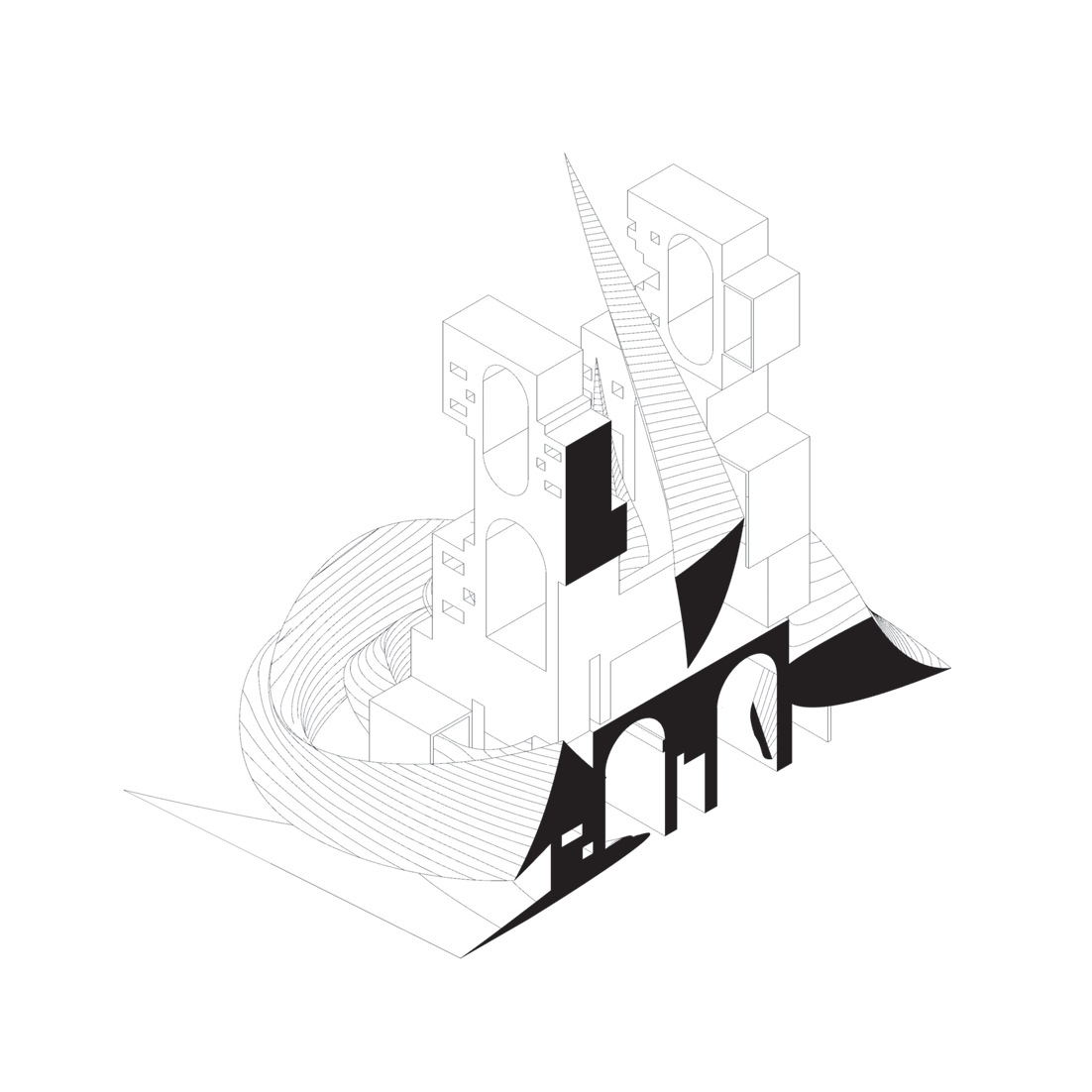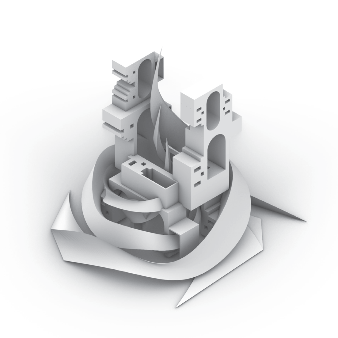 - Plan registers the arch voids; oblique shows the swirl enveloping the blocky masses.
