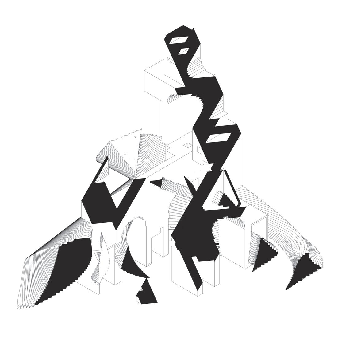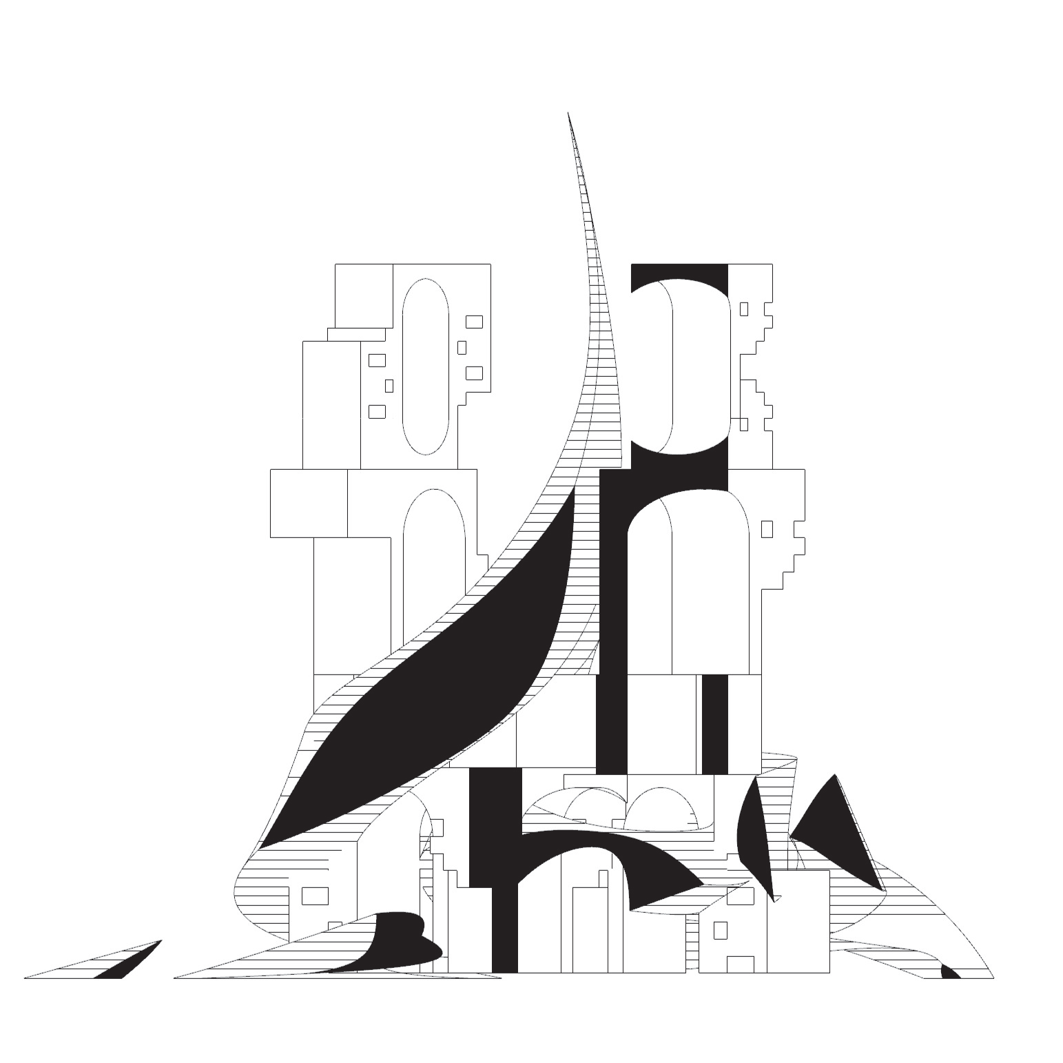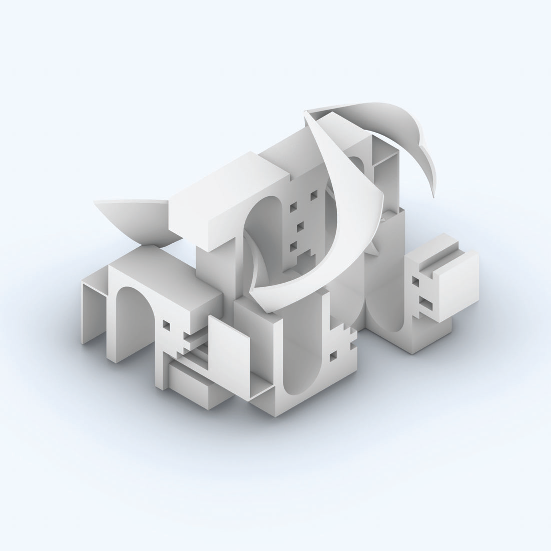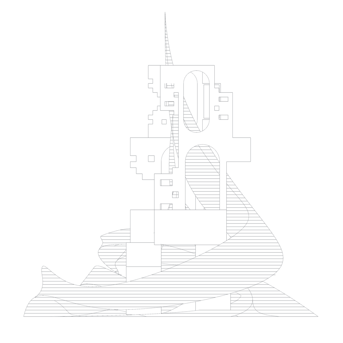 - Plan registers the arch voids; oblique shows the swirl enveloping the blocky masses.