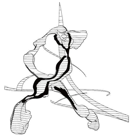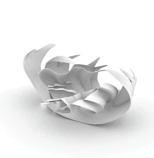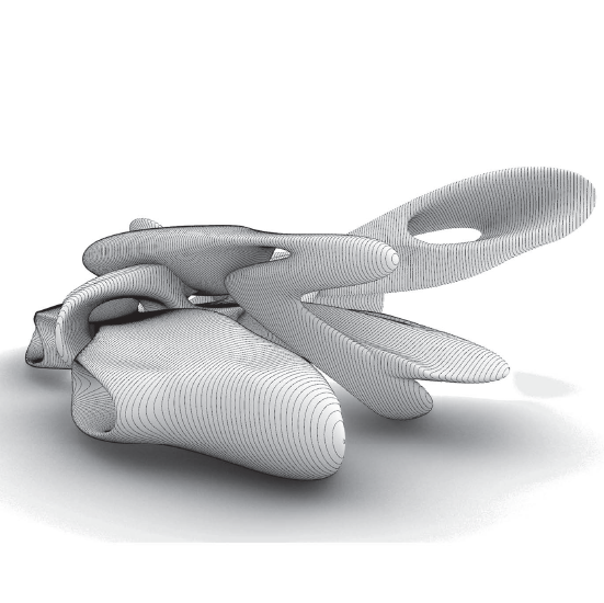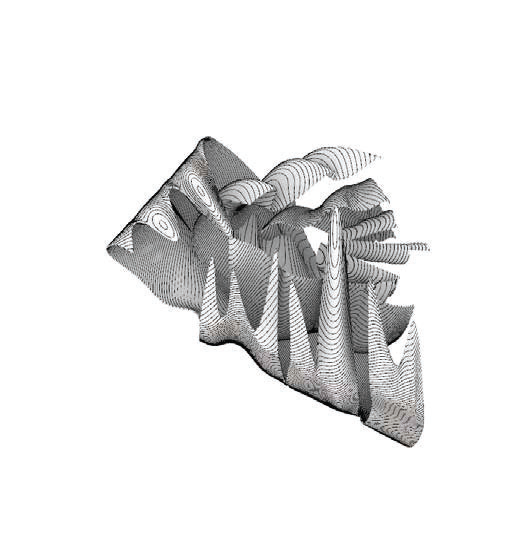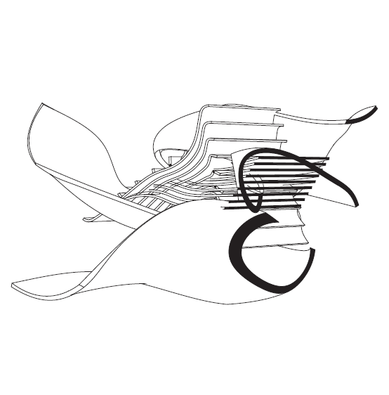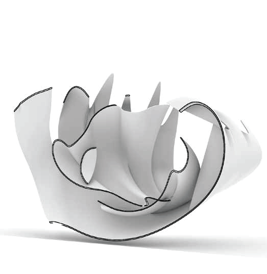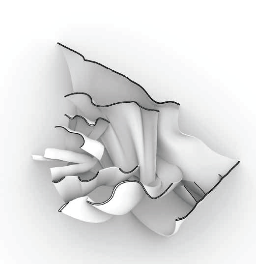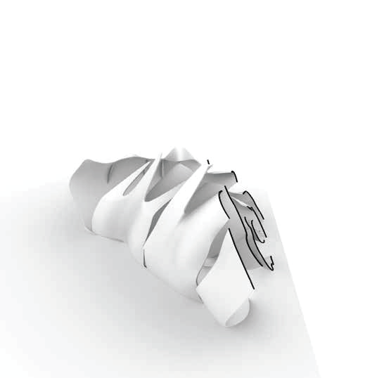 이동/복사/회전/스케일로 작은 창발적 변이를 주면서 주 제스처의 지속적 읽기를 탐구한다. 이어서 디지털 텍토닉 전환을 수행해 모델 내부에서 두께와 결구를 가정하고 읽기의 변화를 확인한다. 초점은 제스처가 어디서 읽히는지를 보여주는 드로잉과 간결한 주석 시퀀스에 있다.