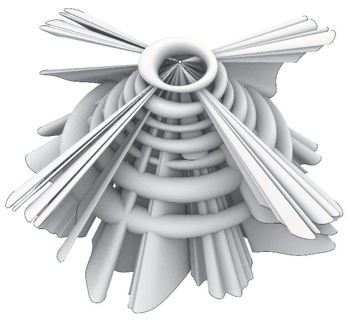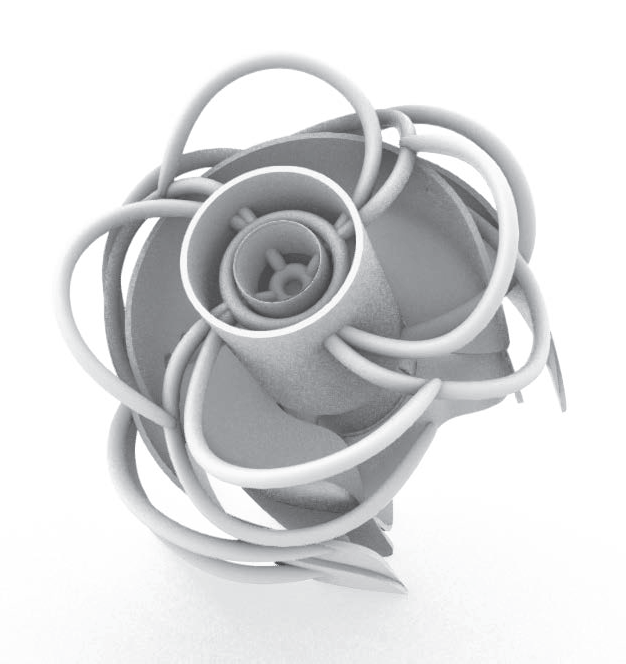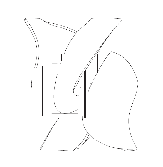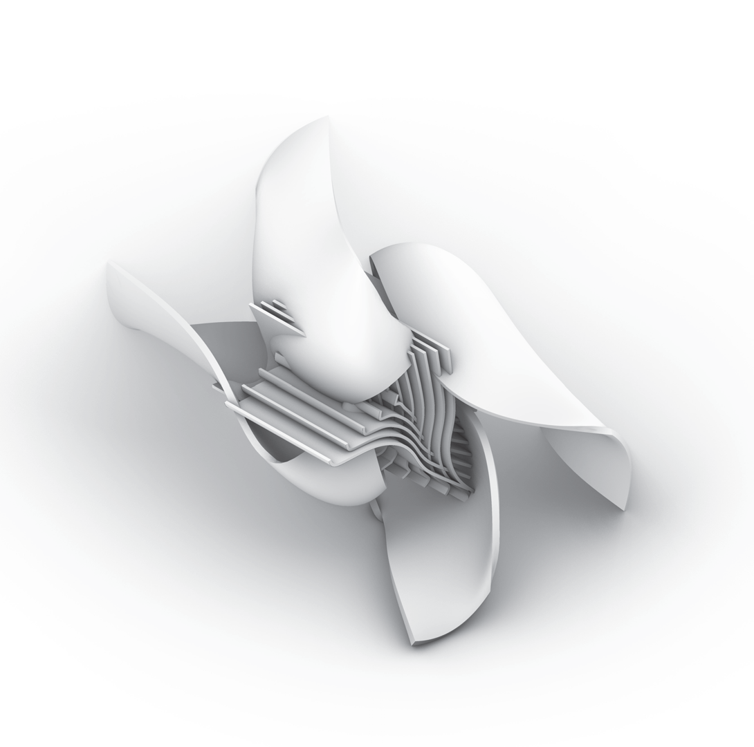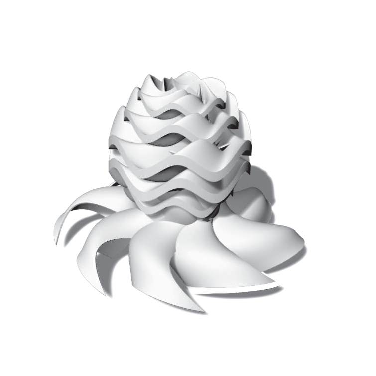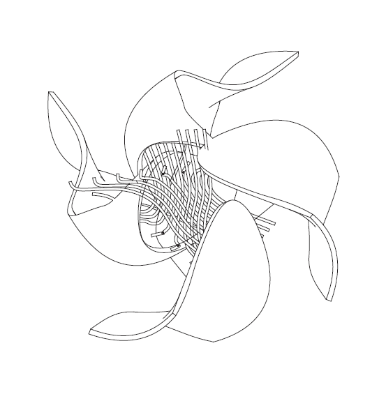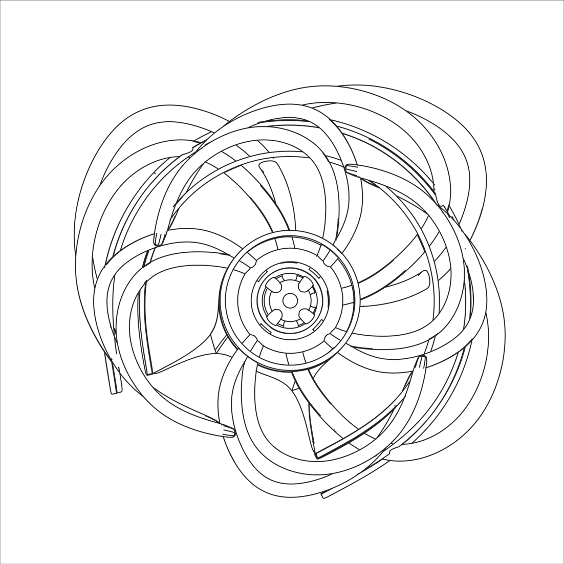 - Radial ribs feeding two counter-rotating fins — “mushroom gills + twin swirls.”