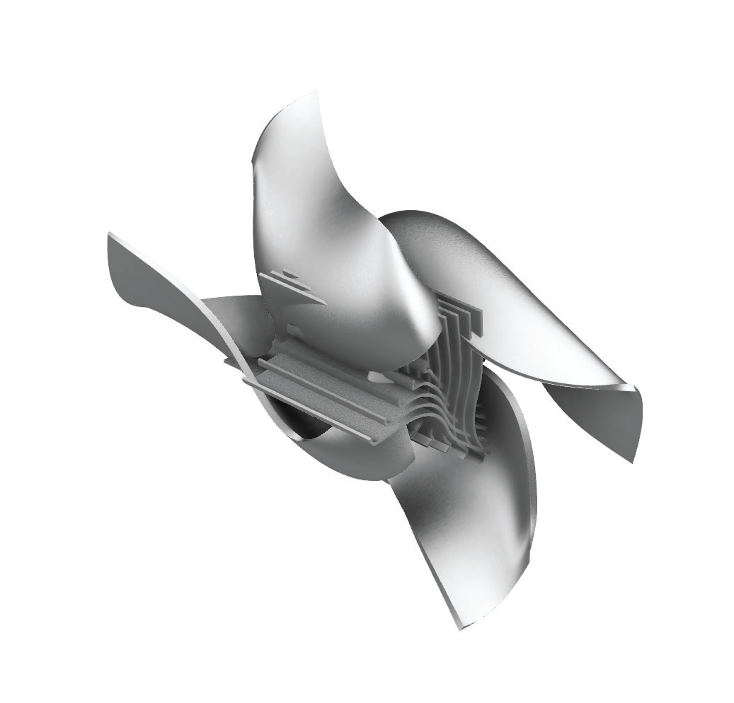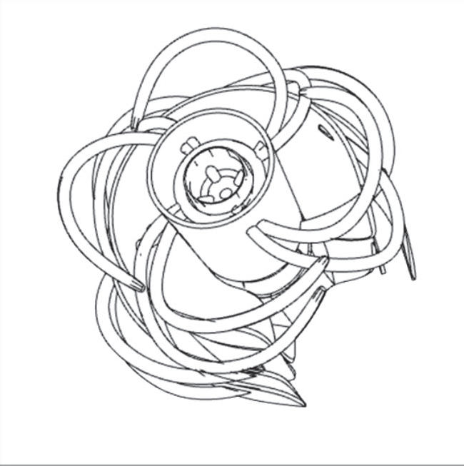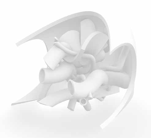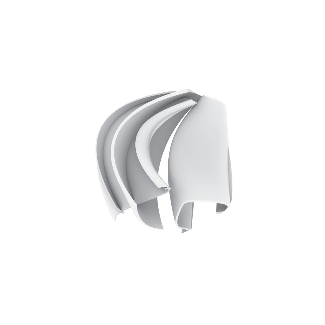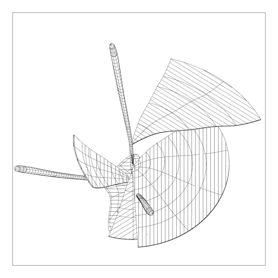 - Radial ribs feeding two counter-rotating fins — “mushroom gills + twin swirls.”
