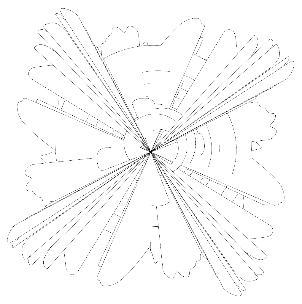 - Petal count and spoke thickness vary, but hub-and-petals remain readable in plan/elevation.