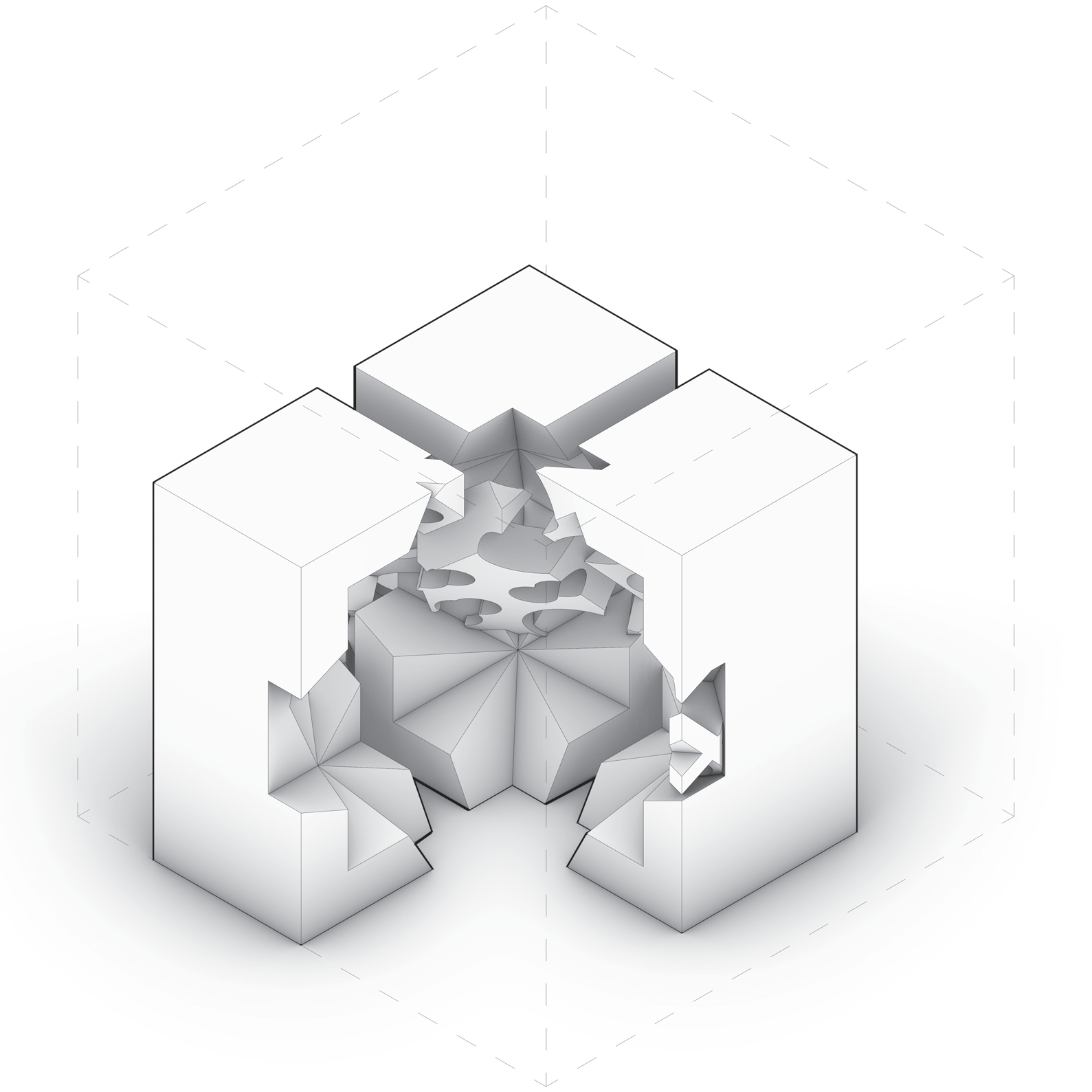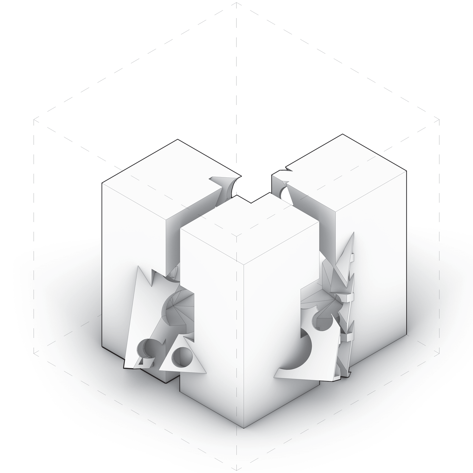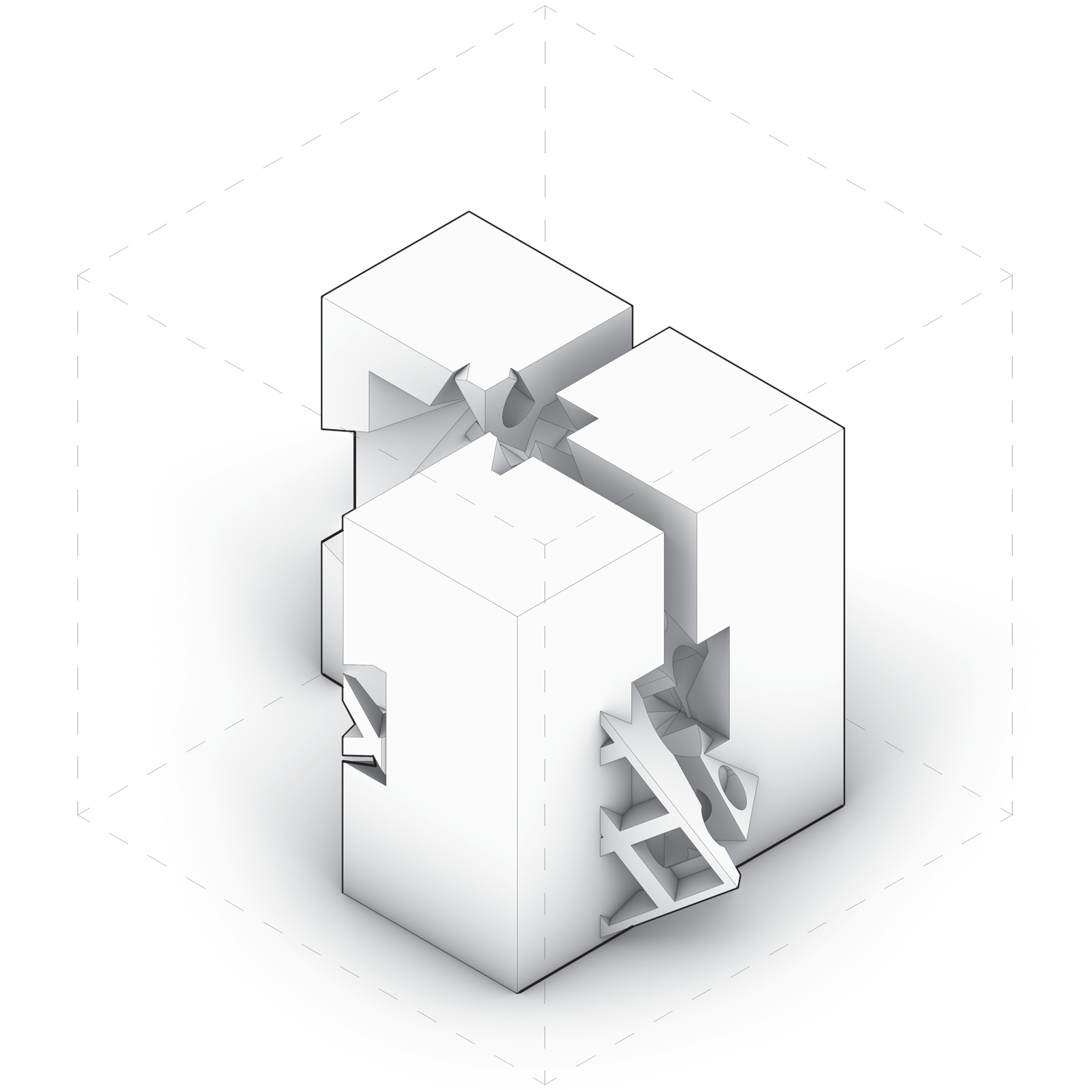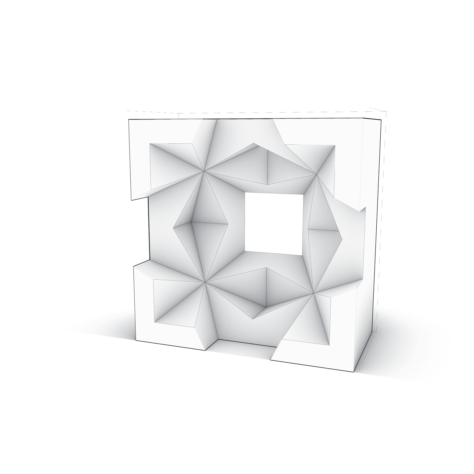 - Individual A — Trim (#1): subtraction edges expose a slot; faceted thresholds.