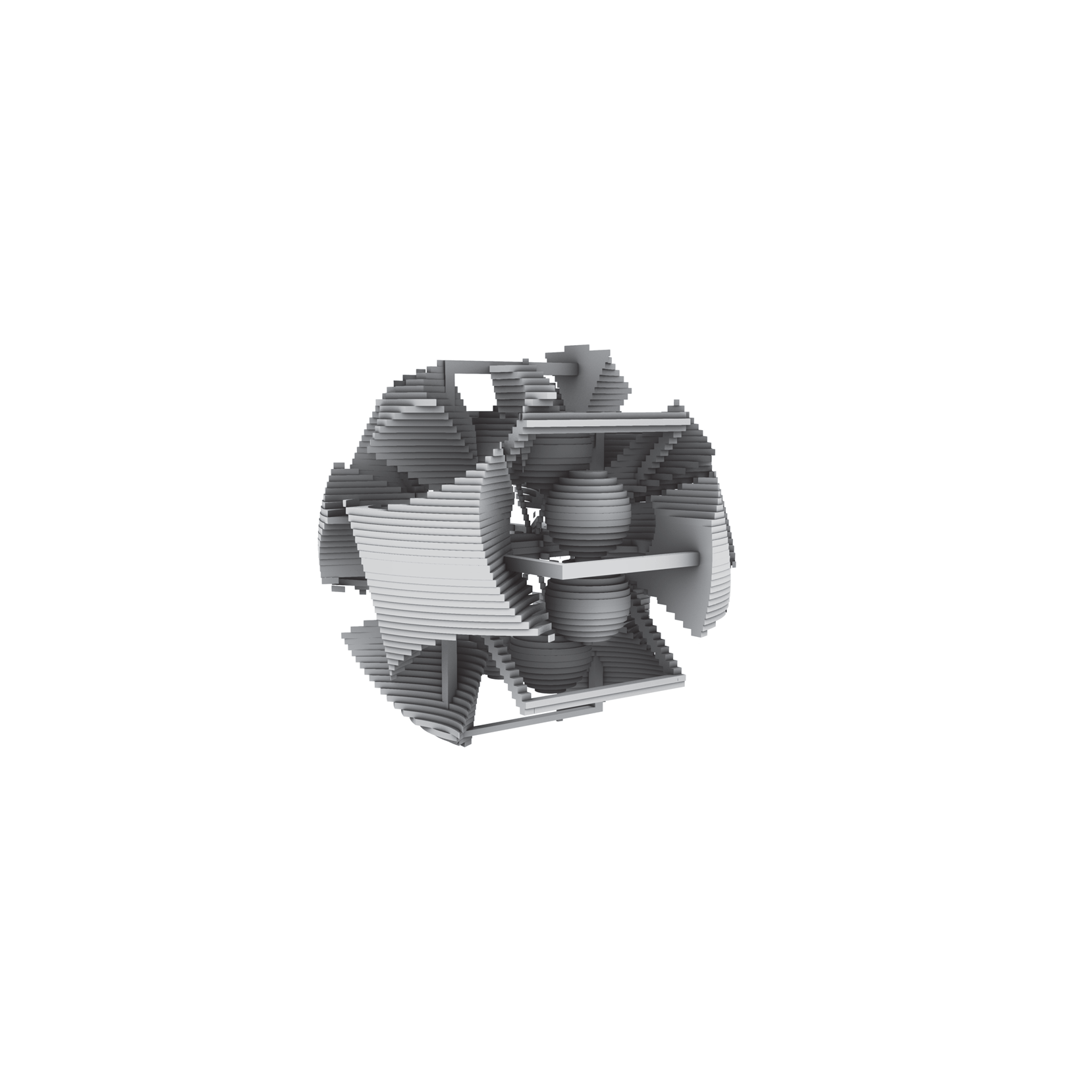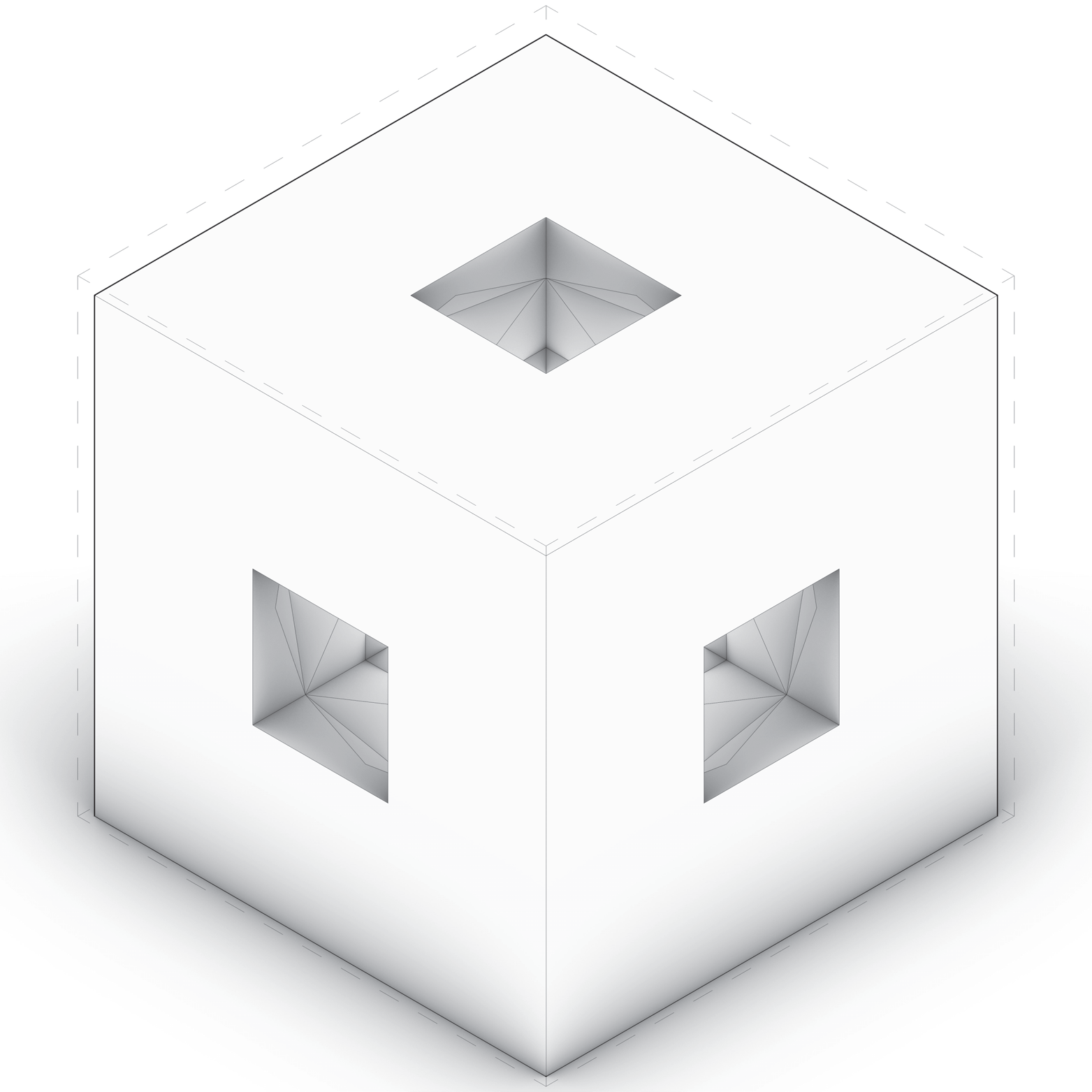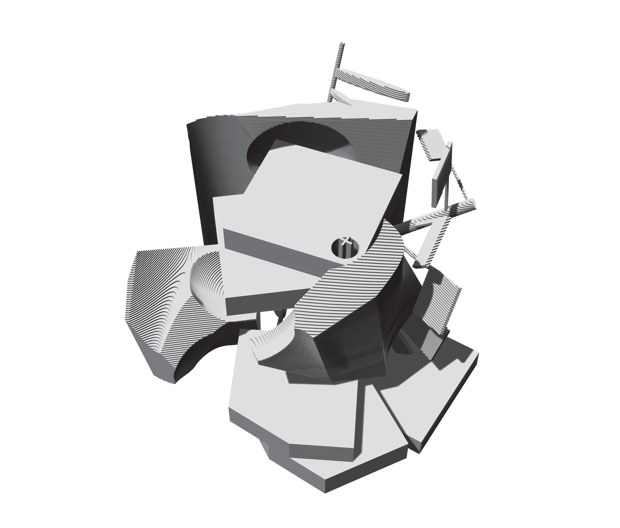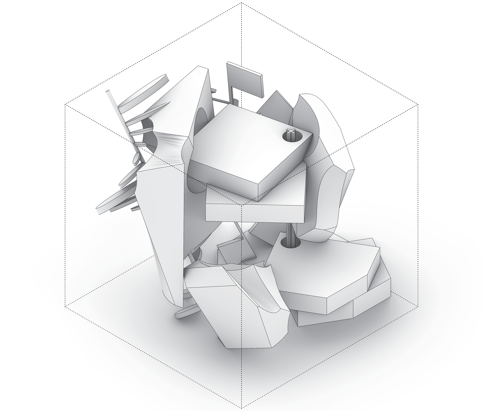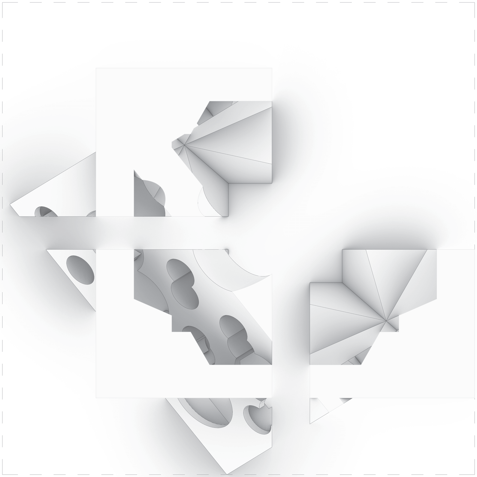 - Individual A — Trim (#1): subtraction edges expose a slot; faceted thresholds.