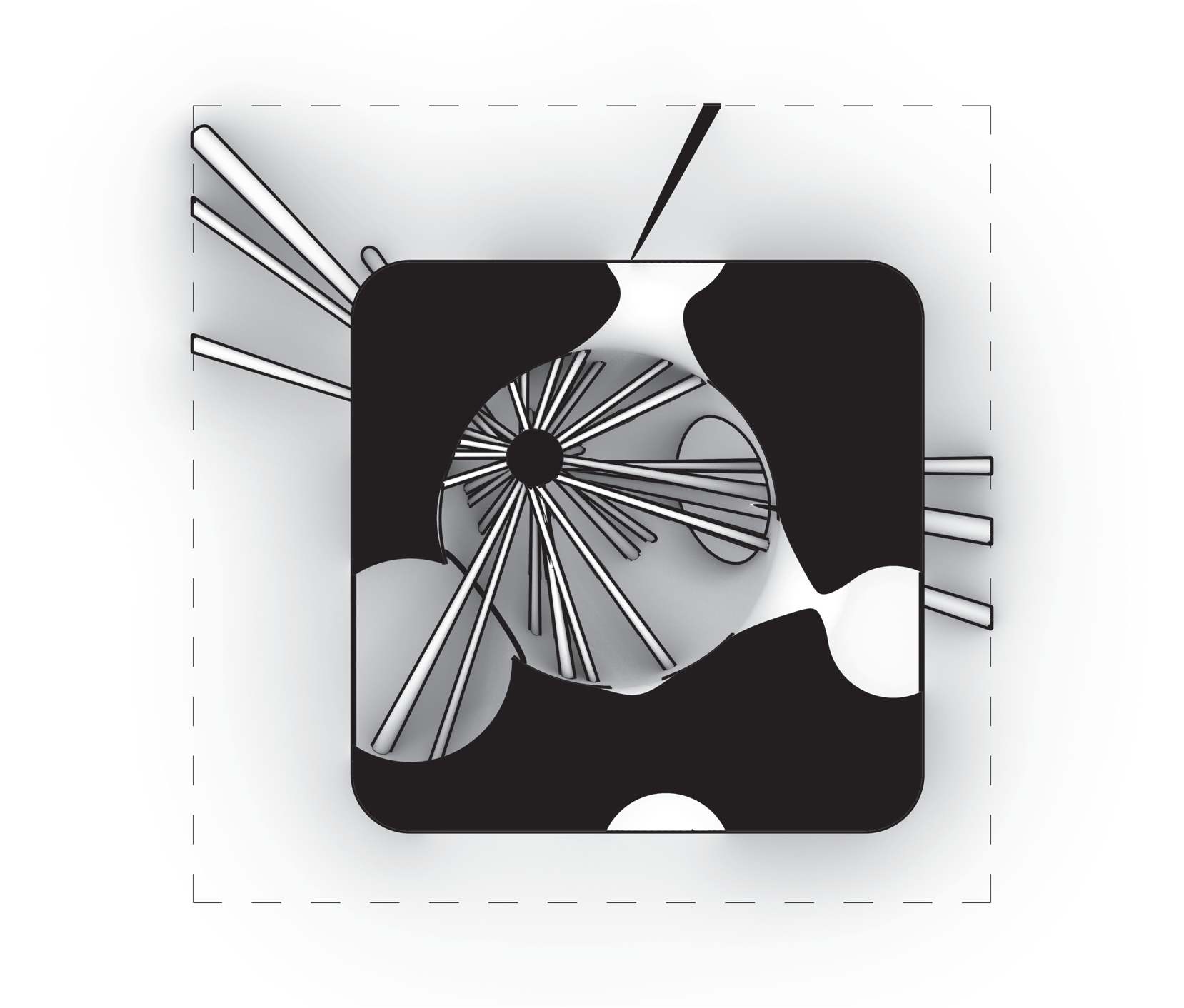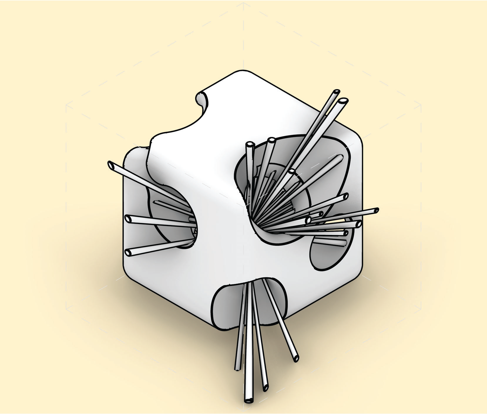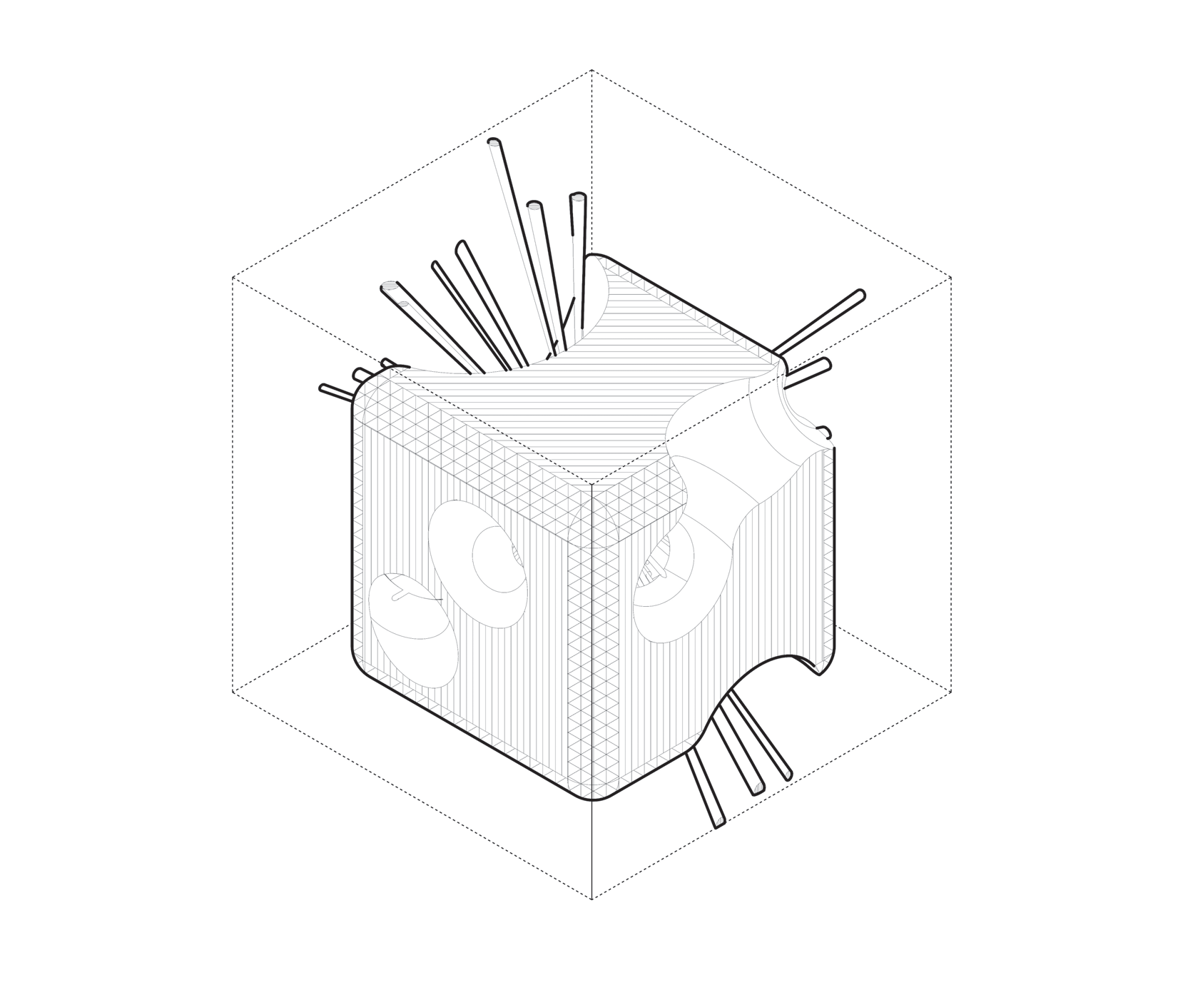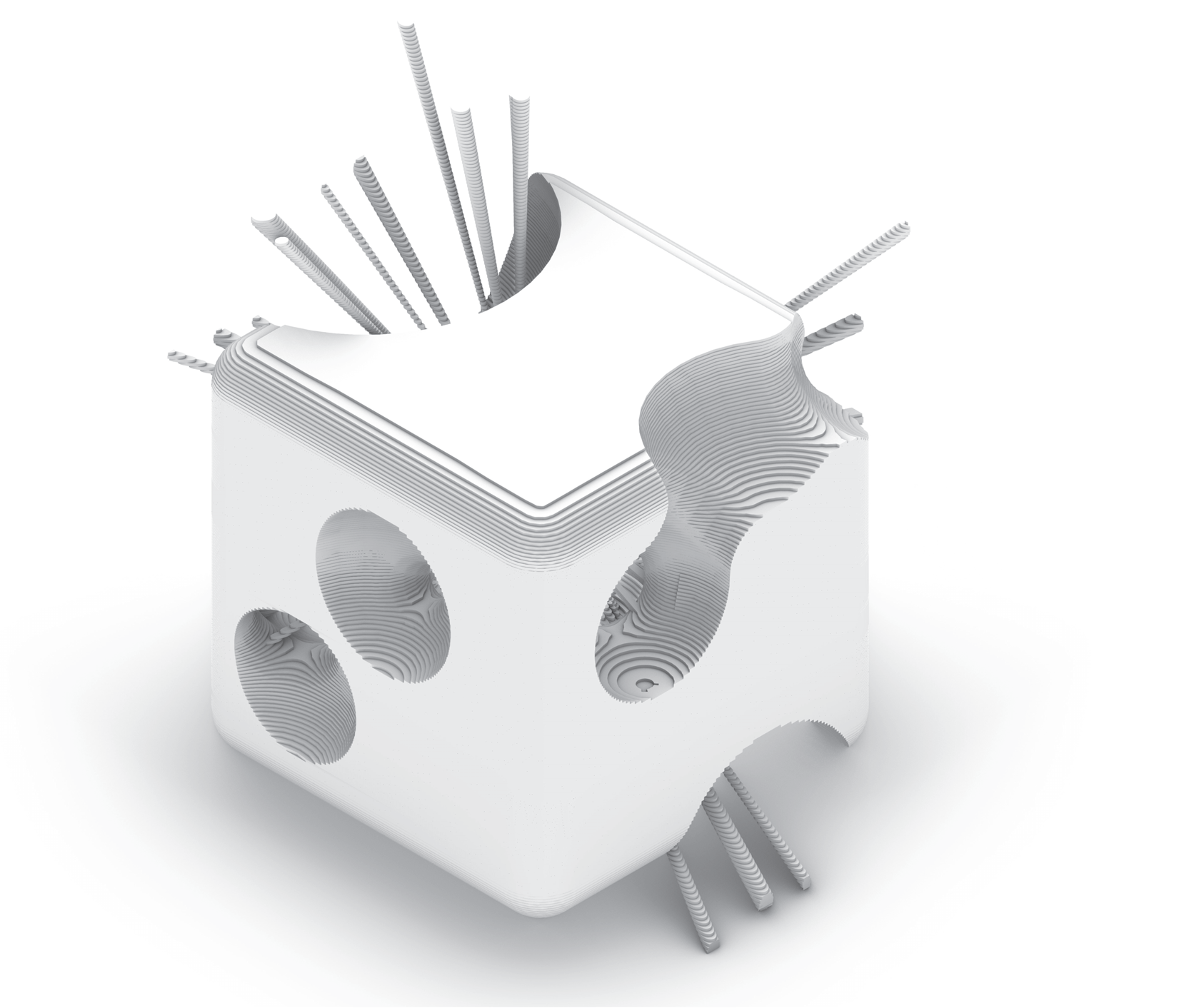 Rounded contours stretched into elongated spans — “filleted edge + extension”.