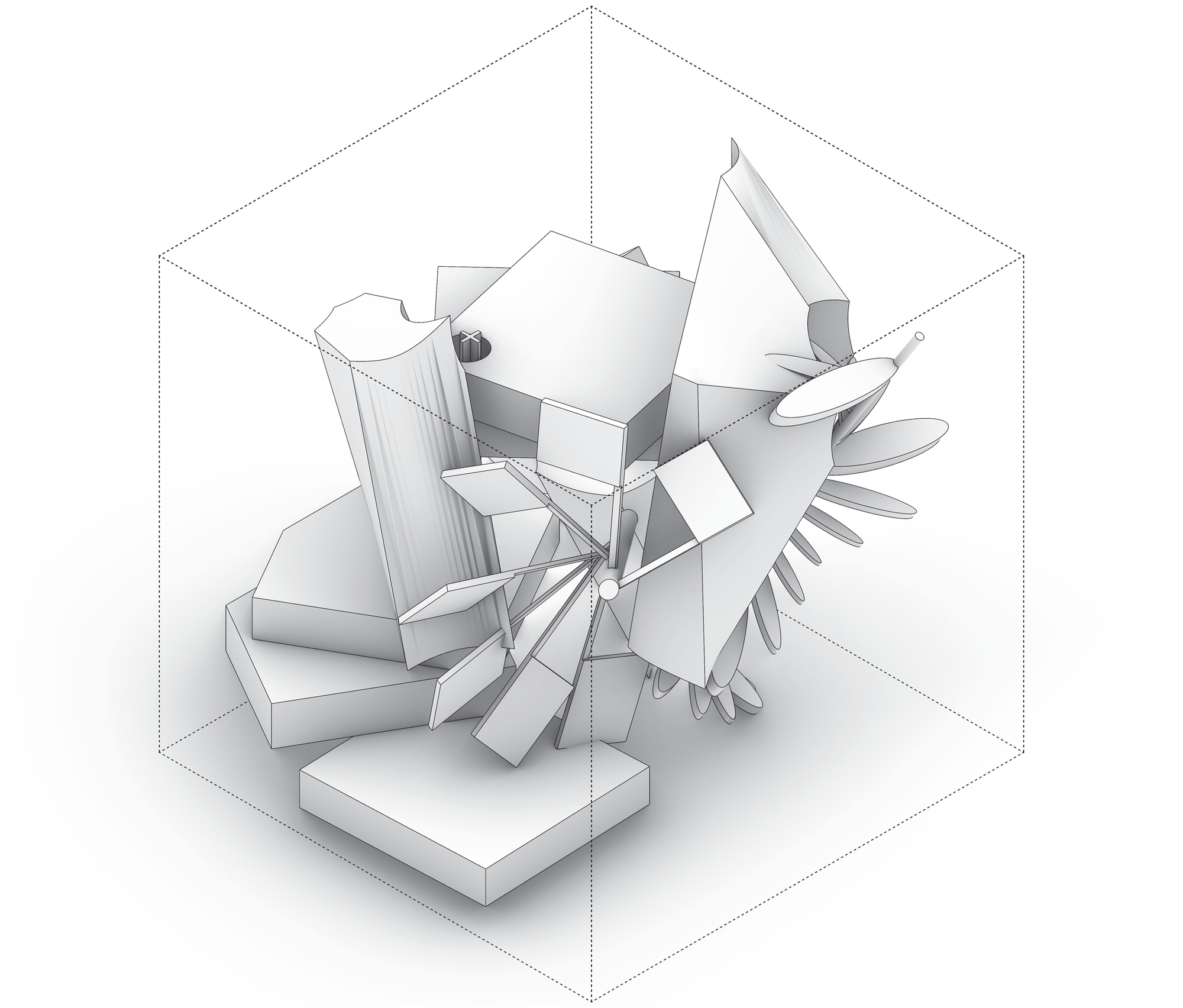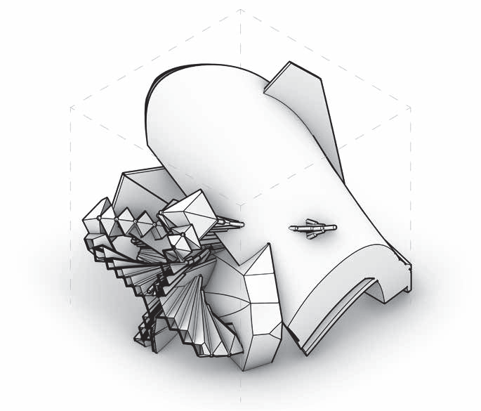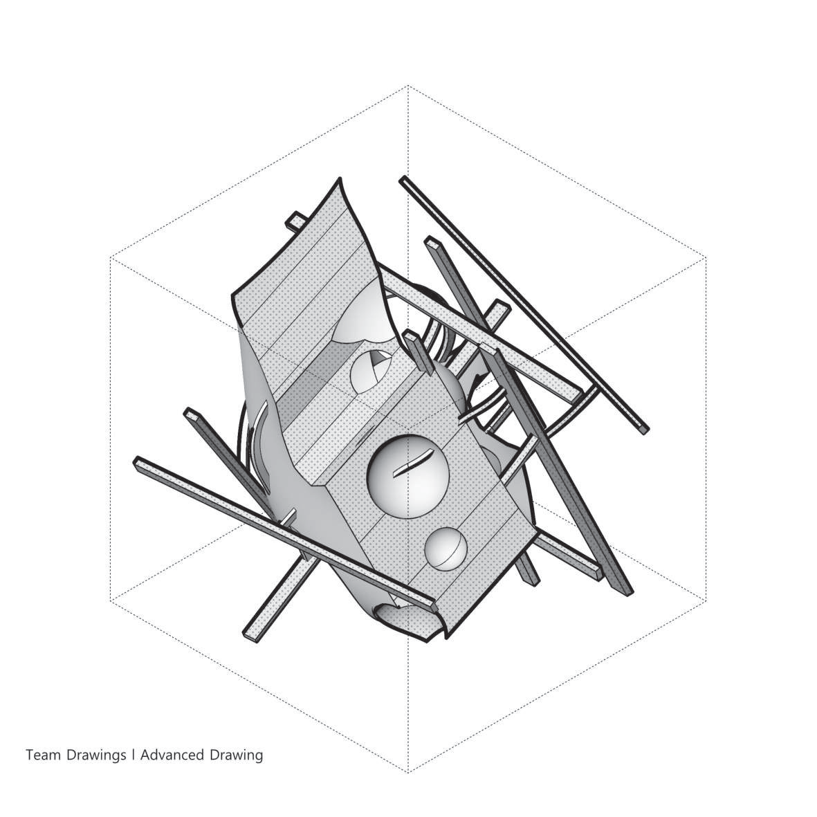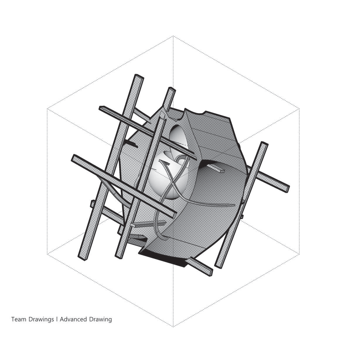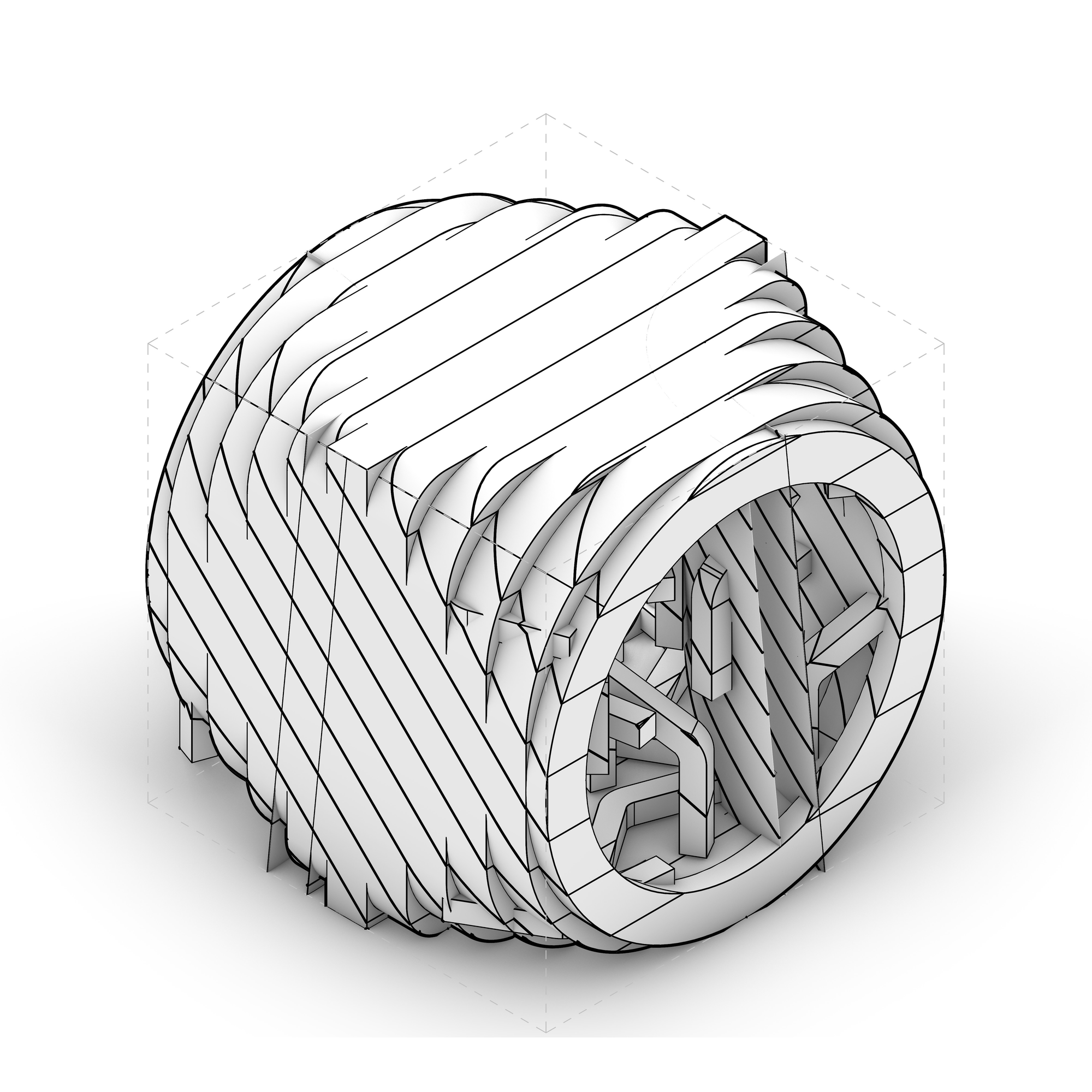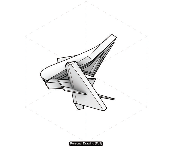 이동/복사/회전/스케일로 작은 창발적 변이를 주면서 주 제스처의 지속적 읽기를 탐구한다. 이어서 디지털 텍토닉 전환을 수행해 모델 내부에서 두께와 결구를 가정하고 읽기의 변화를 확인한다. 초점은 제스처가 어디서 읽히는지를 보여주는 드로잉과 간결한 주석 시퀀스에 있다.