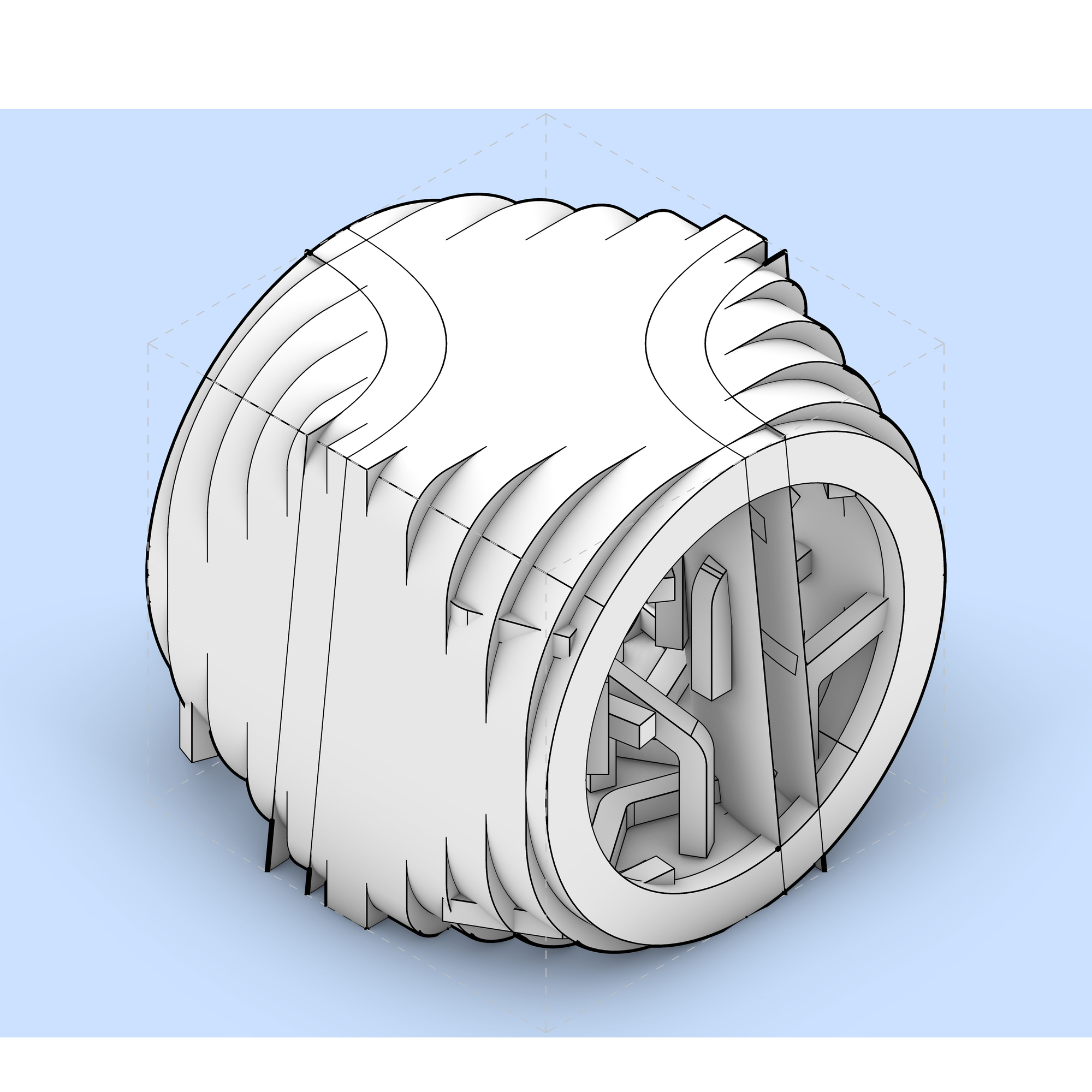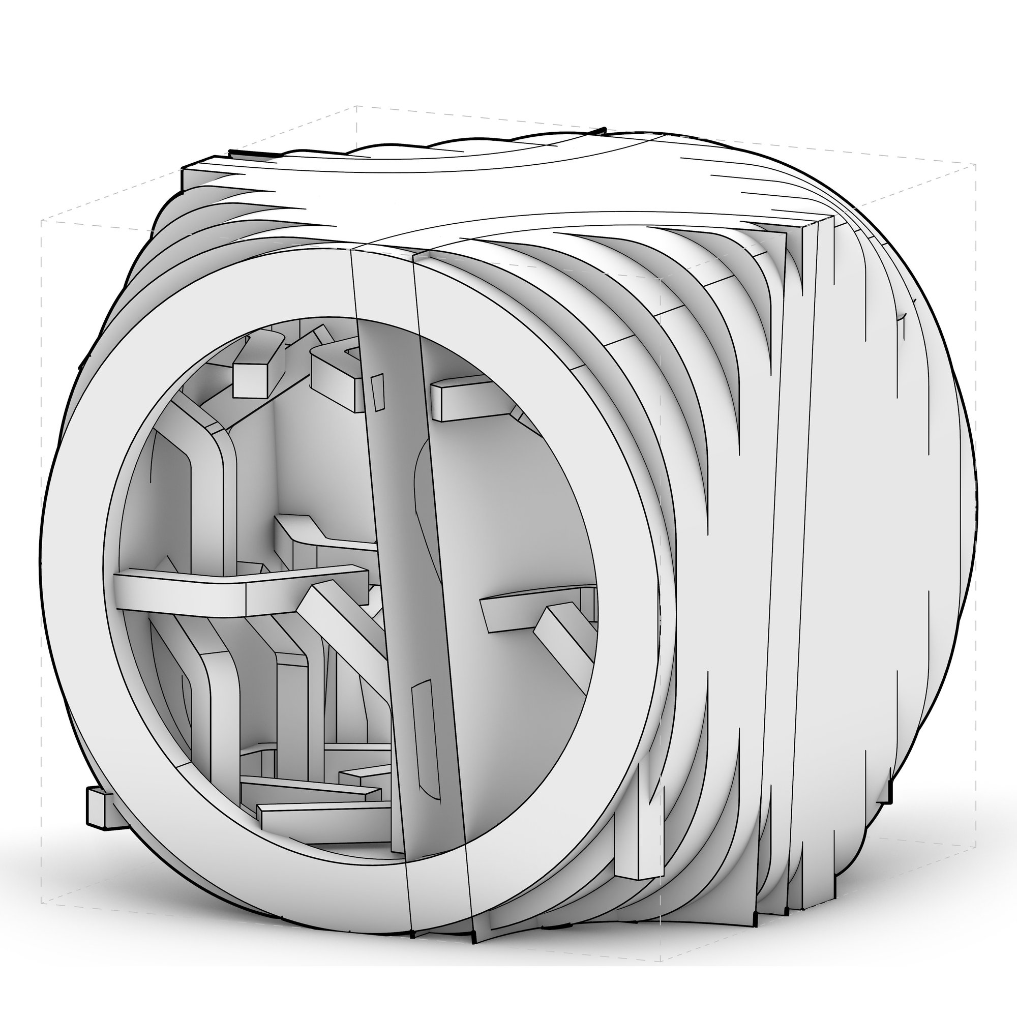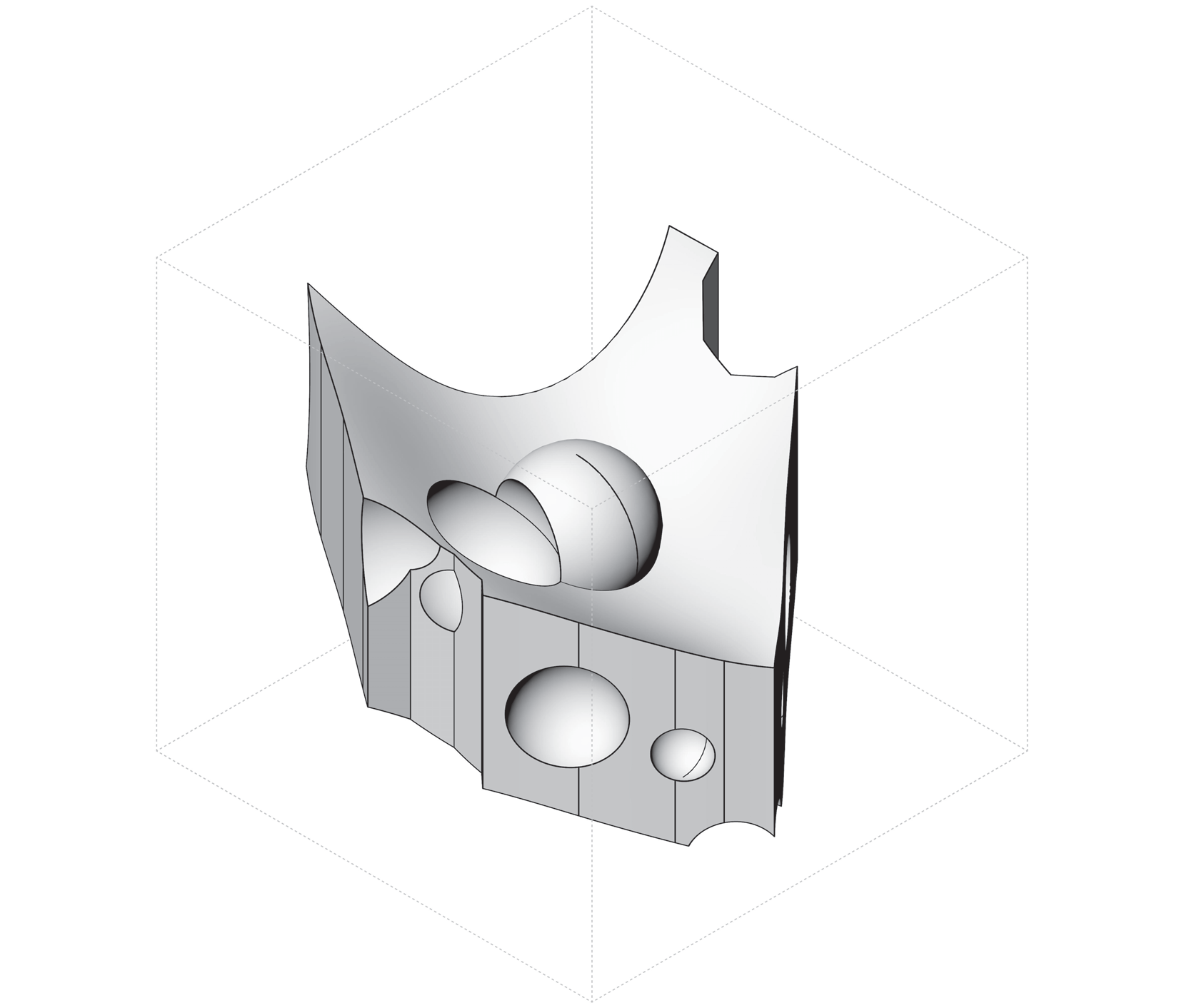 A rounded body selectively carved by notches — “curved mass + slot”.
